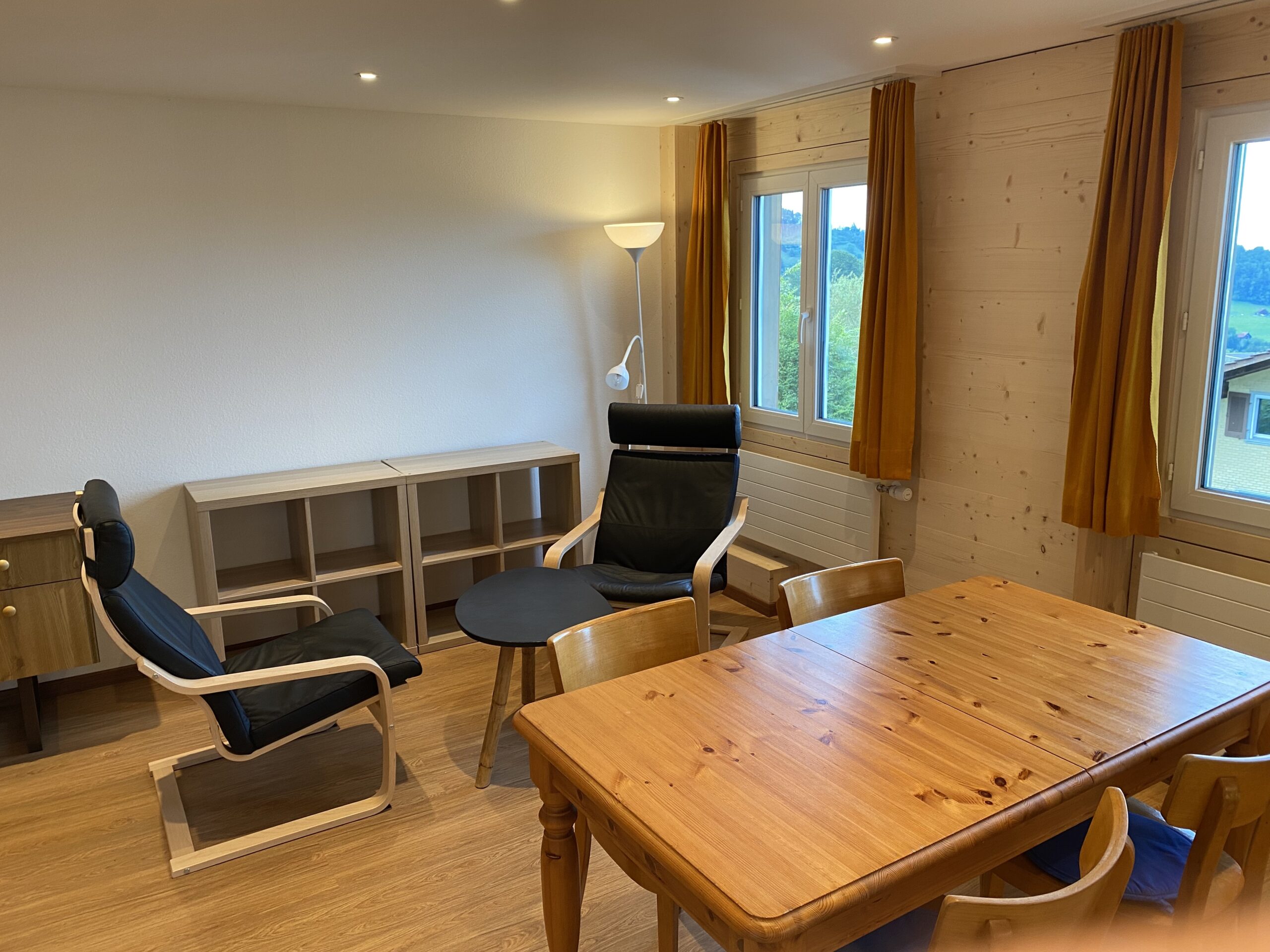 - grosser Tisch mit vier Stühlen