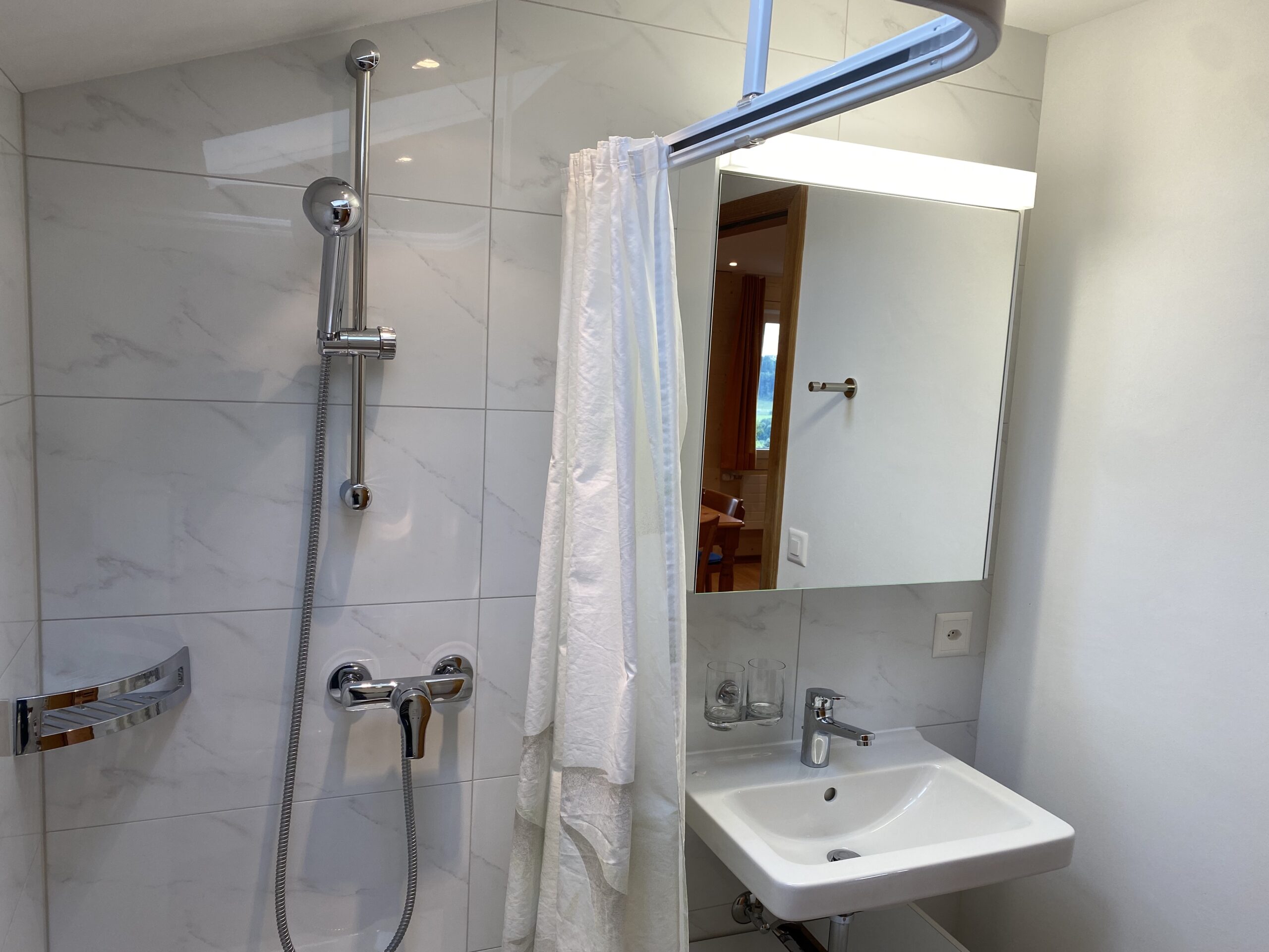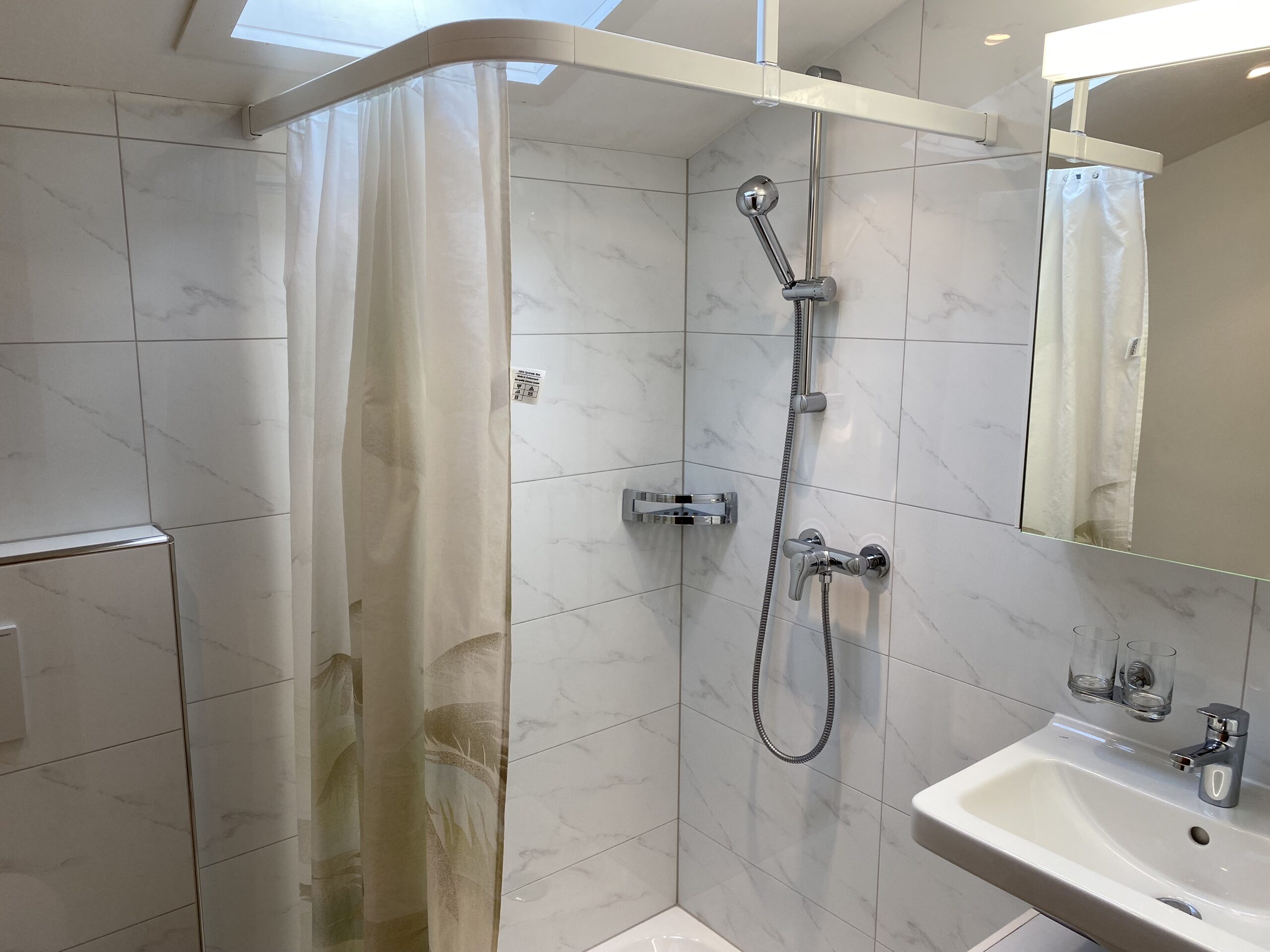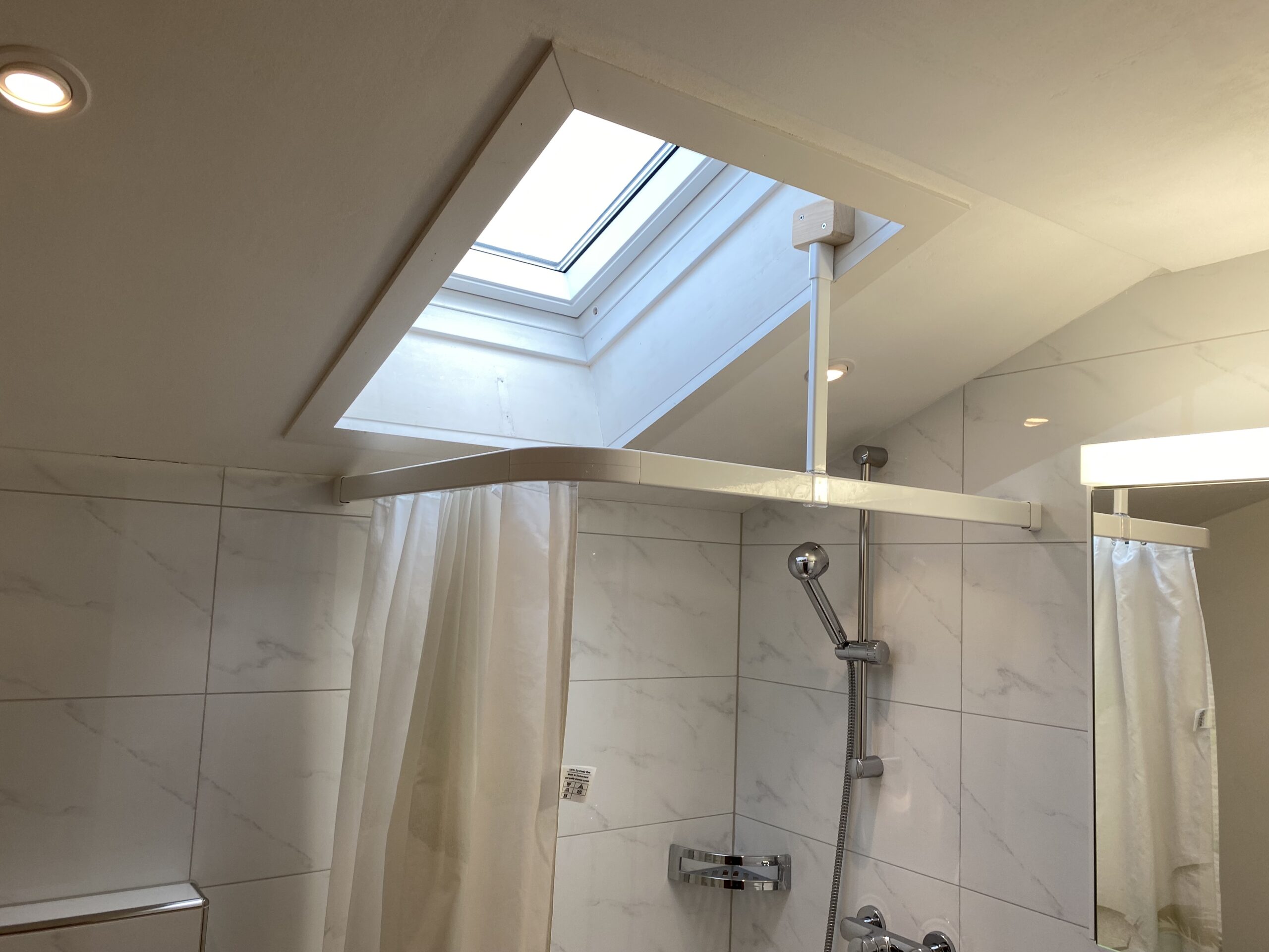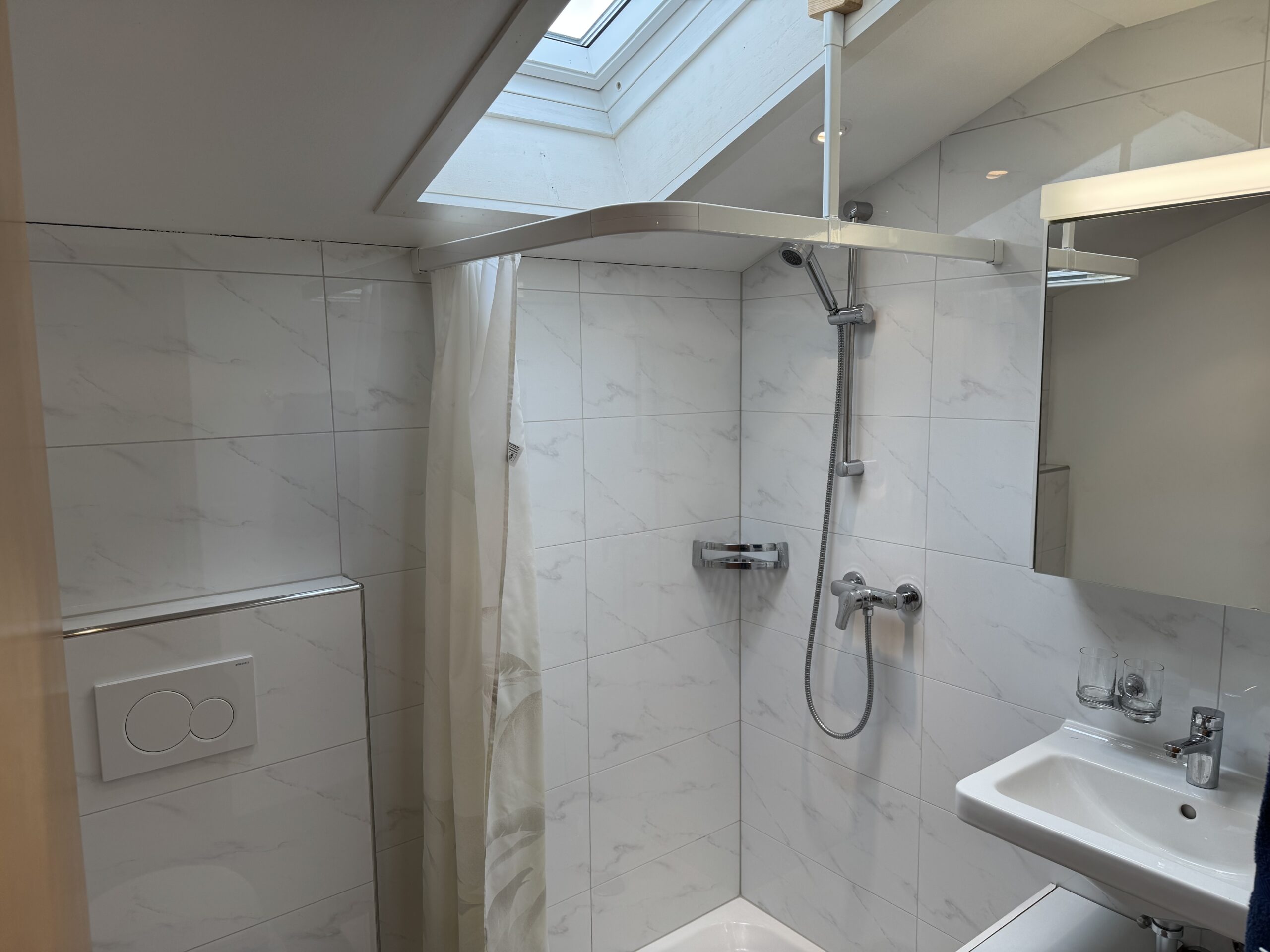 - grosszügiges Bad mit WC, Dusche & Lavabo mit Spiegelschrank, Handtuchhalter und Dachfenster