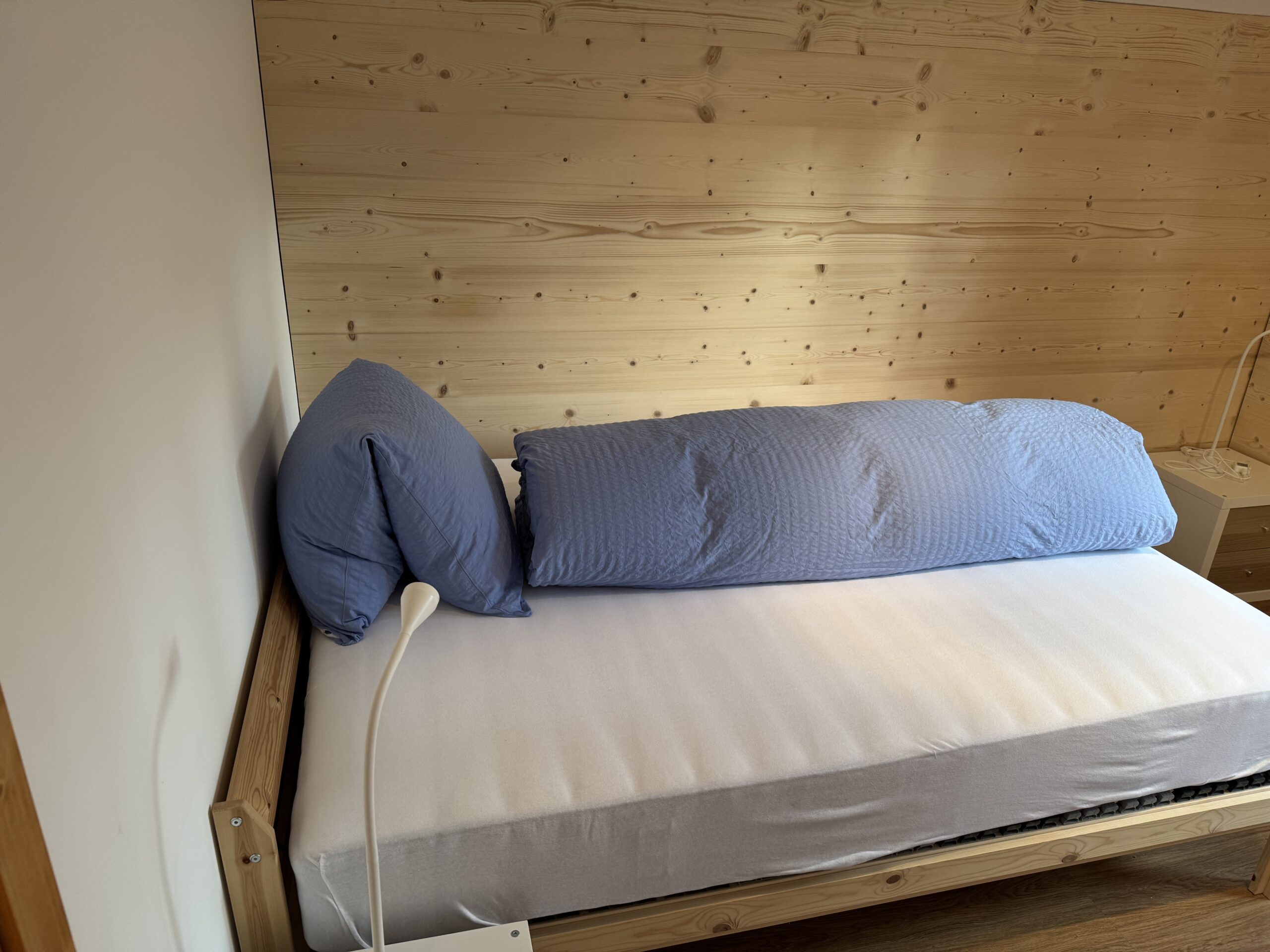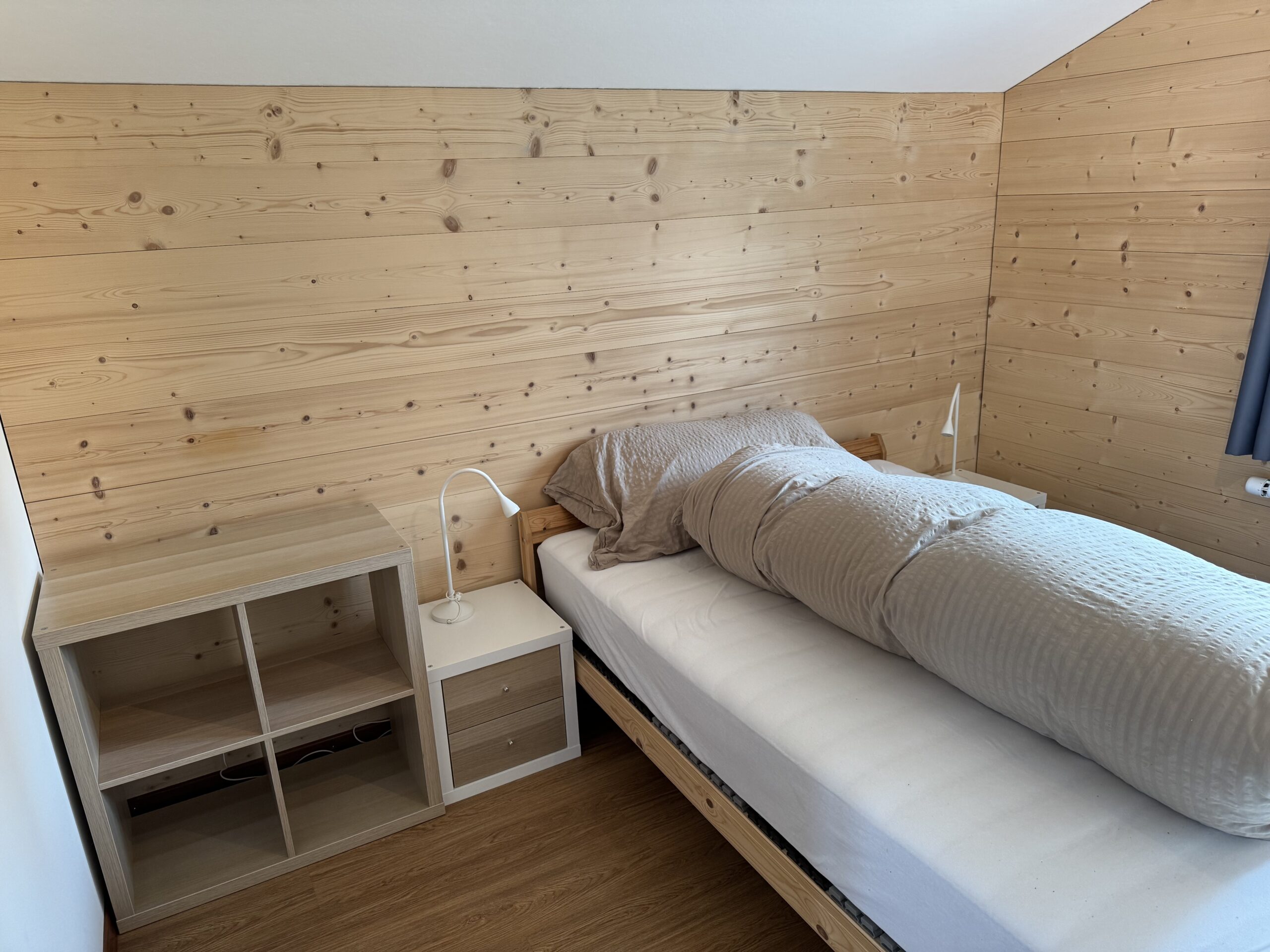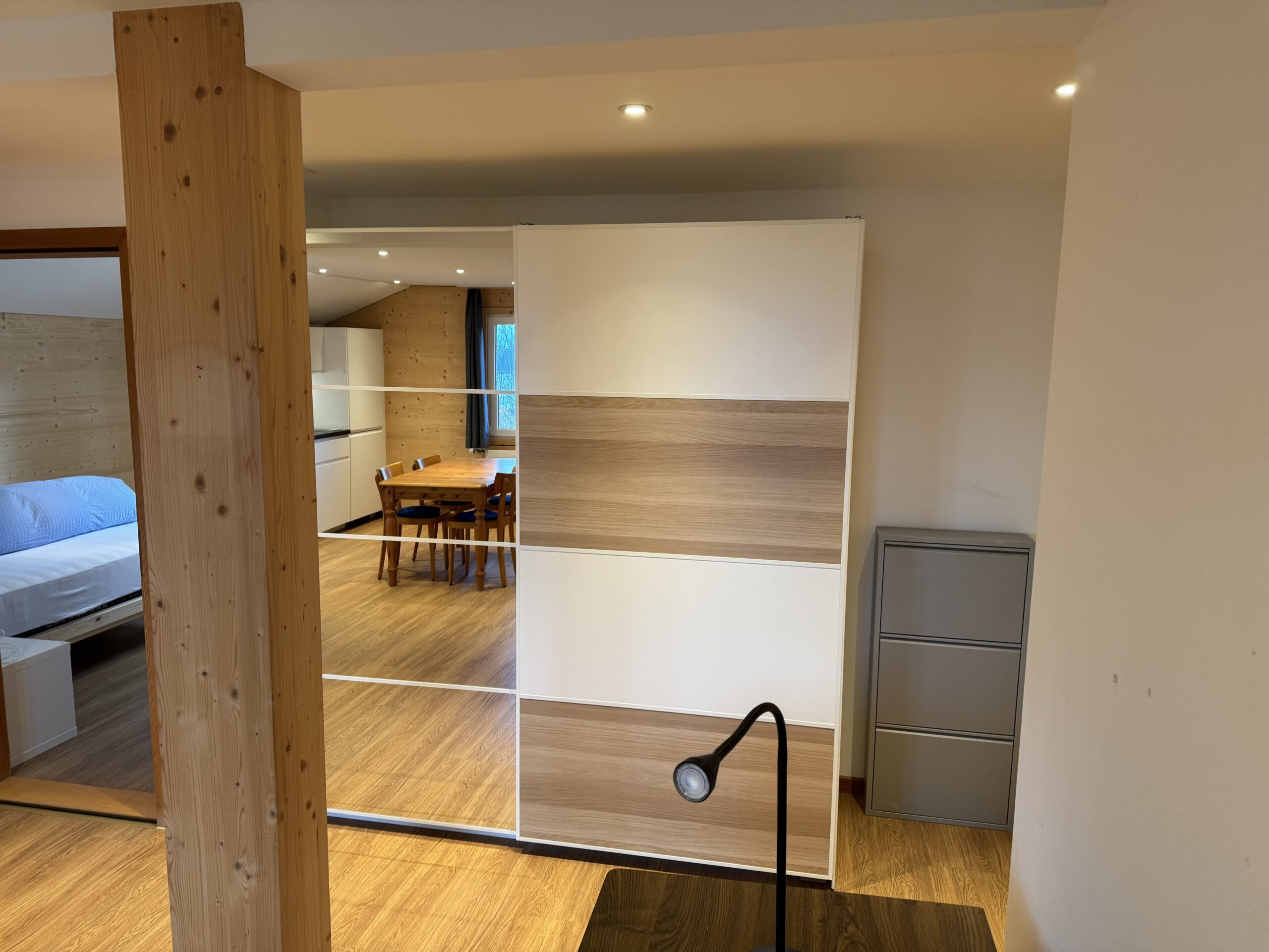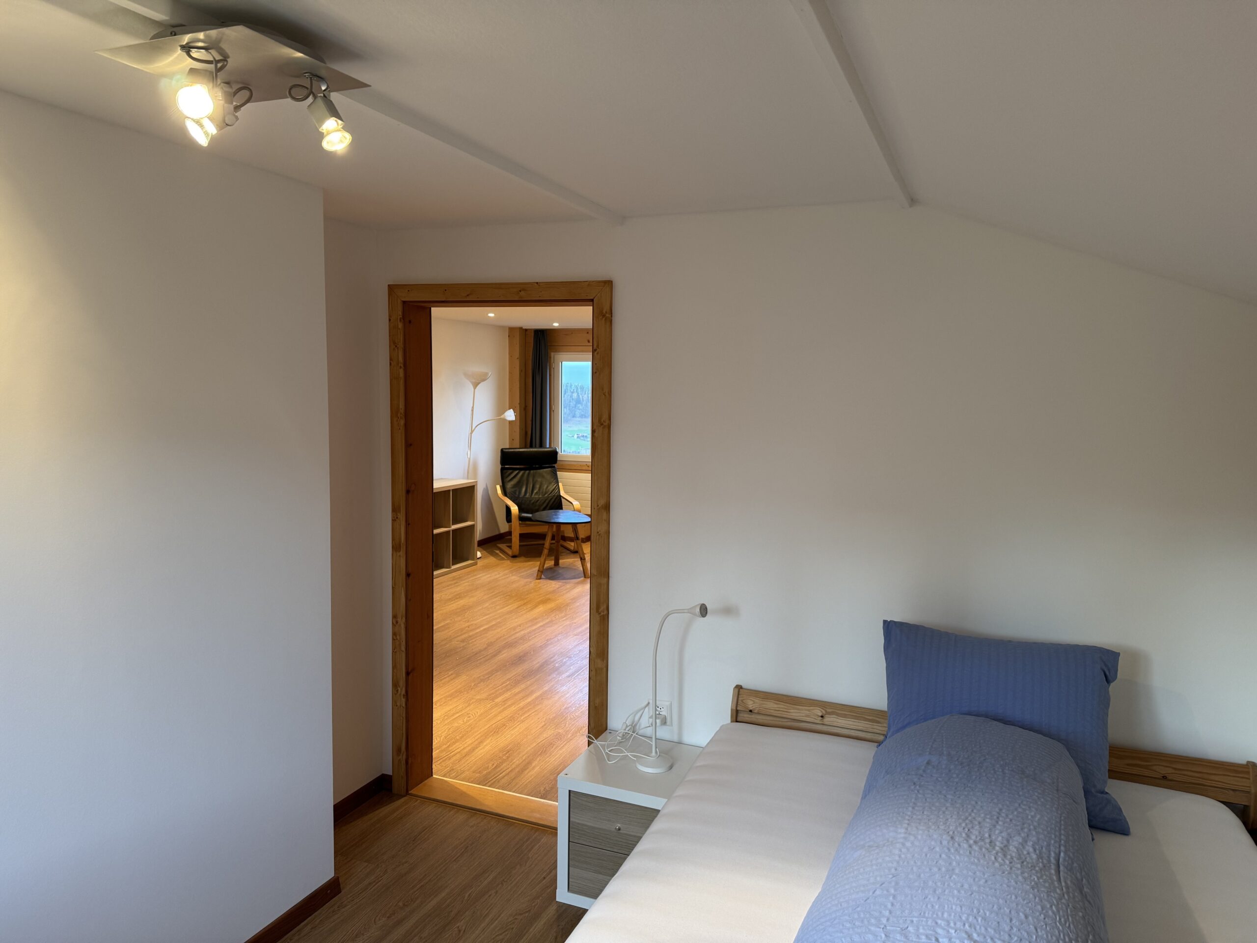 Schlafzimmer mit grossem Bett, Wohnzimmer mit Kochnische, Dusche/WC mit Tageslicht